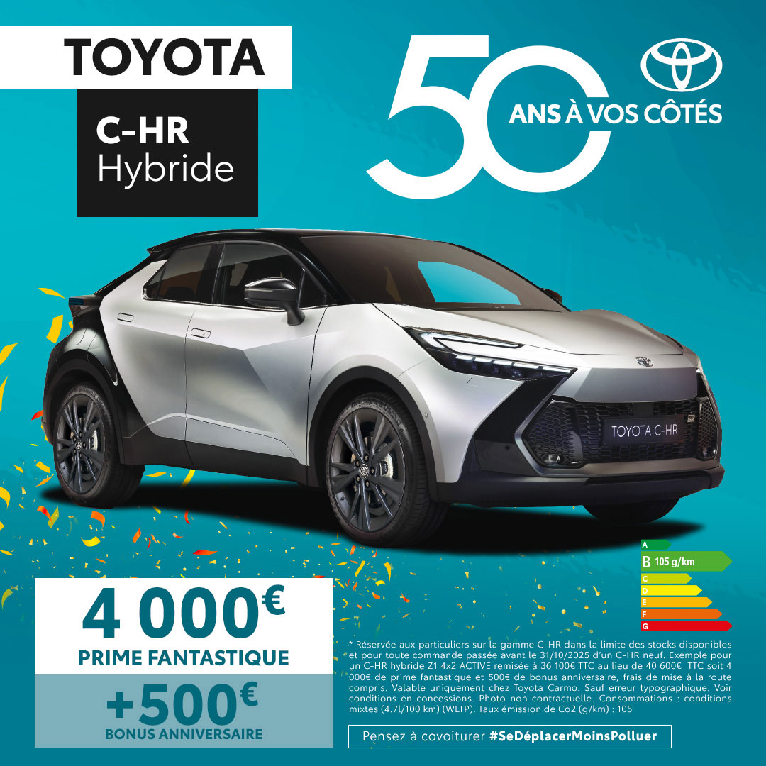 Toyota C-HR Hybride – 4 000 € Prime Fantastique + 500 € Bonus Anniversaire