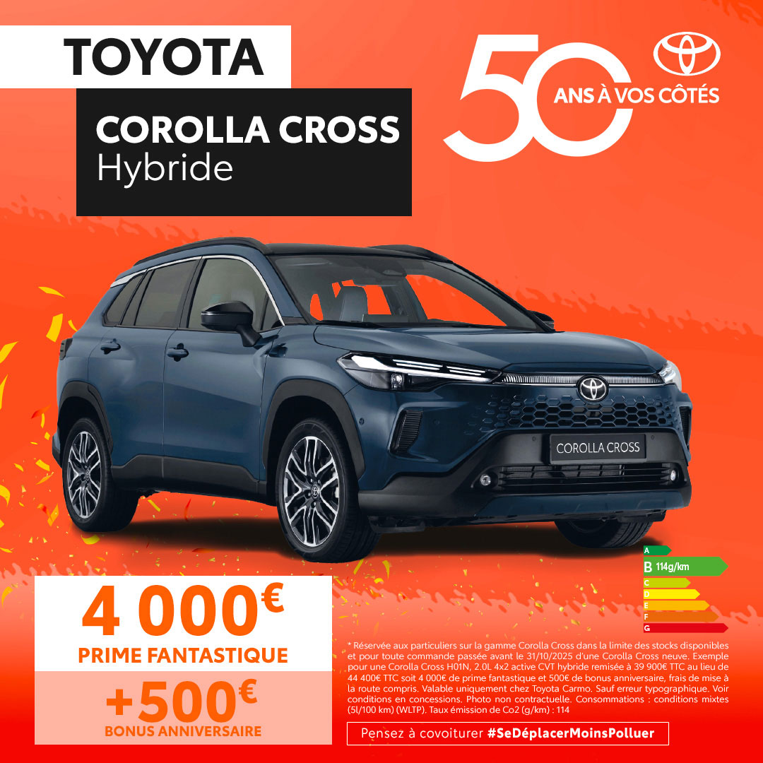 * Réservée aux particuliers sur la gamme Corolla Cross dans la limite des stocks disponibles et pour toute commande passée avant le 31/10/2025 d’une Corolla Cross neuve. Exemple pour une Corolla Cross H01N, 2.0L 4×2 active CVT hybride remisée à 39 900€TTC au lieu de 44 400€ TTC soit 4000€ de prime fantastique et 500€ de bonus anniversaire, frais de mise à la route compris.