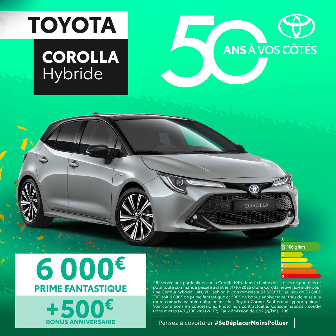 * Réservée aux particuliers sur la gamme Corolla dans la limite des stocks disponibles et pour toute commande passée avant le 31/10/2025 d’une Corolla neuve. Exemple pour une Corolla hybride H4N, 2L Fashion Bi-ton remisée à 33 300€TTC au lieu de 39 800€ TTC soit 6000€ de prime fantastique et 500€ de bonus anniversaire, frais de mise à la route compris.