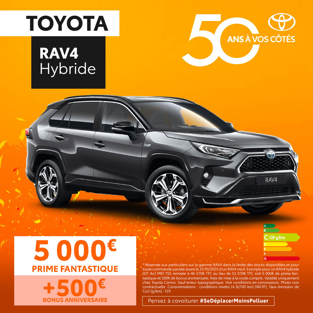 * Réservée aux particuliers sur la gamme RAV4 dans la limite des stocks disponibles et pour toute commande passée avant le 31/10/2025 d’un RAV4 neuf. Exemple pour un RAV4 hybride 02T 4×2 MID TSS remisée à 46 570€TTC au lieu de 52 070 TTC soit 5000€ de prime fantastique et 500€ de bonus anniversaire, frais de mise à la route compris.