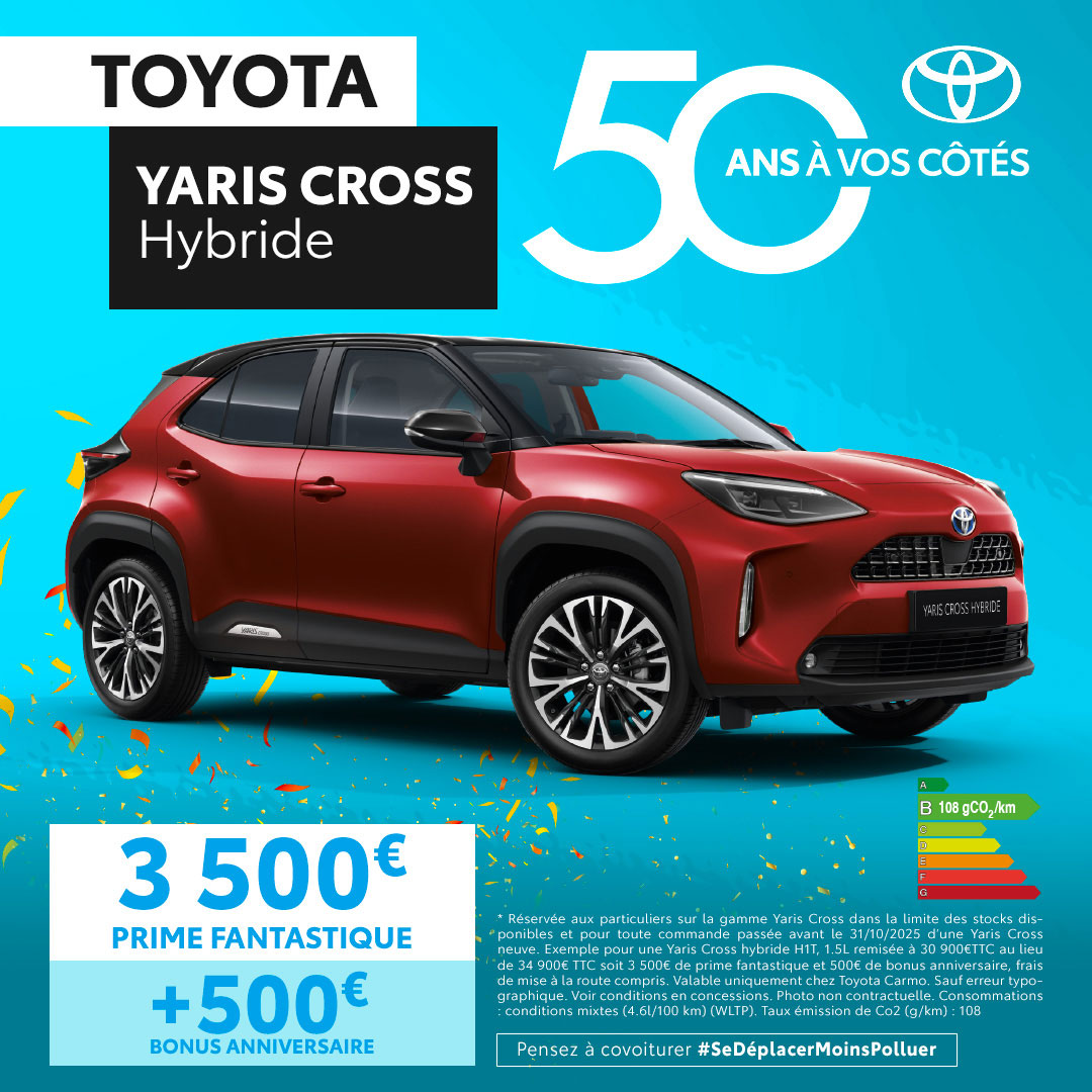 * Réservée aux particuliers sur la gamme Yaris Cross dans la limite des stocks disponibles et pour toute commande passée avant le 31/10/2025 d’une Yaris Cross neuve. Exemple pour une Yaris Cross hybride H1T, 1.5L remisée à 30 900€TTC au lieu de 34 900€ TTC soit 3500€ de prime fantastique et 500€ de bonus anniversaire, frais de mise à la route compris.