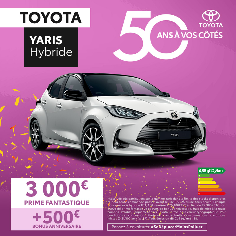 * Réservée aux particuliers sur la gamme Yaris dans la limite des stocks disponibles et pour toute commande passée avant le 31/10/2025 d’une Yaris neuve. Exemple pour une Yaris hybride HTT, 1.5L remisée à 26 400€TTC au lieu de 29 900€ TTC soit 3000€ de prime fantastique et 500€ de bonus anniversaire, frais de mise à la route compris.